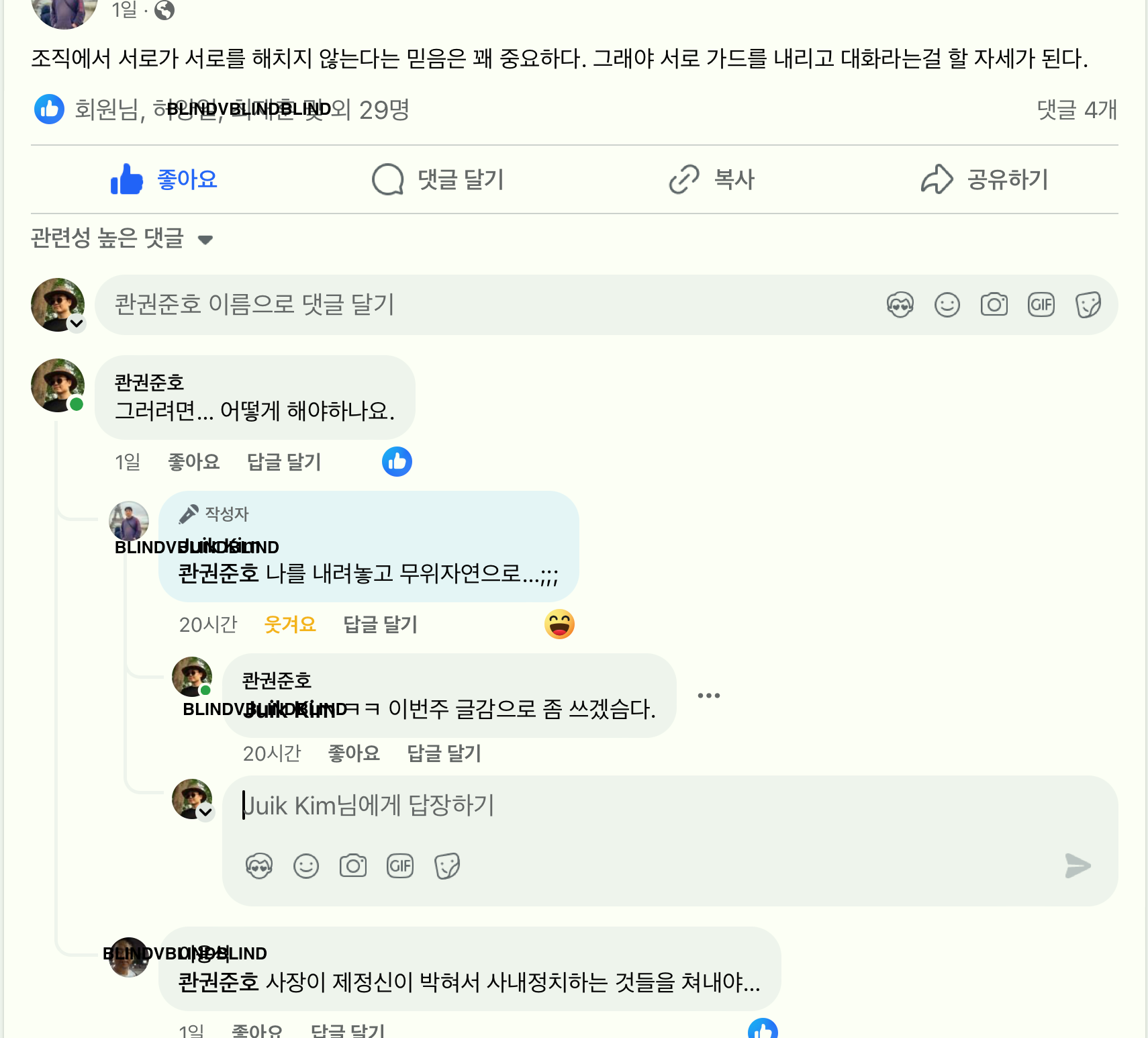 “조직에서 서로가 서로를 해치지 않는다는 믿음은 꽤 중요하다. 그래야 서로 가드를 내리고 대화라는걸 할 자세가 된다.” 맞는 말입니다.