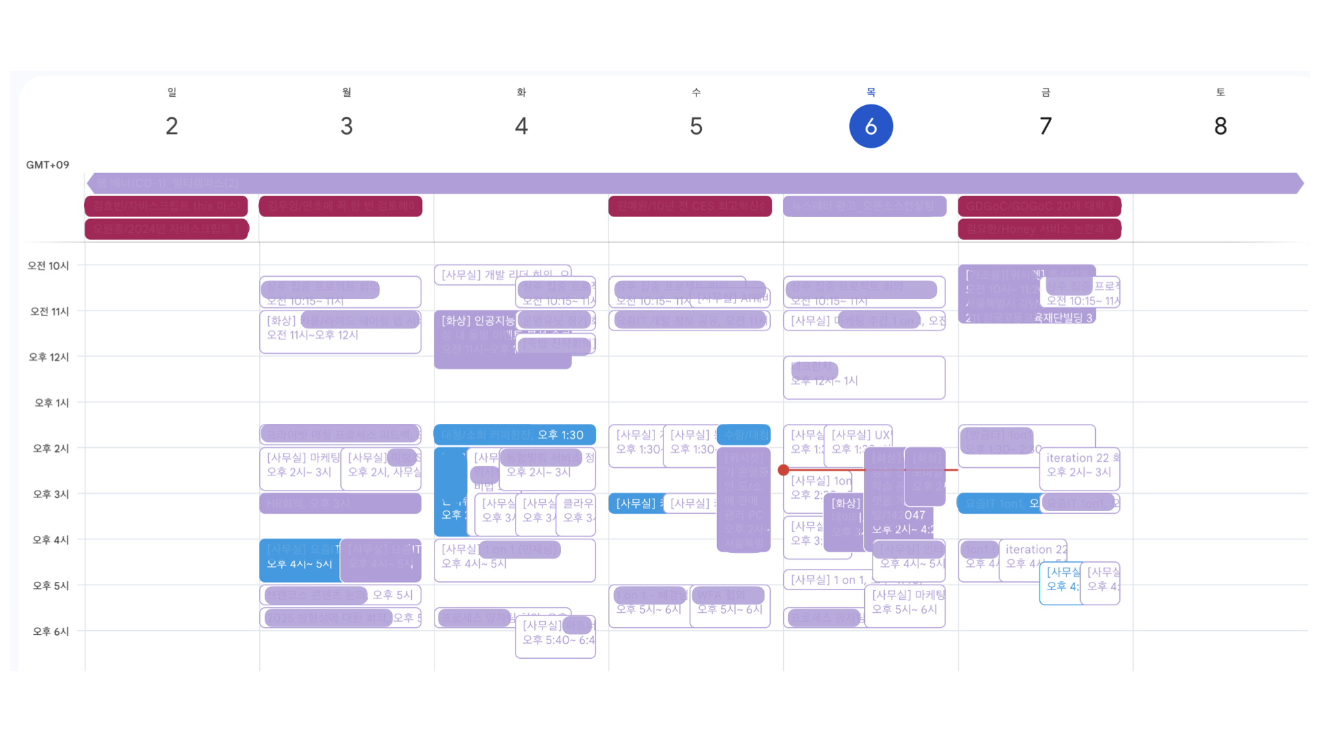 하루종일 가득찬 캘린더로 일주일을 살아갑니다. 일단 반복되는 정기회의가 한줄은 빼곡하게 채우고 있고, 요청사항이 가득한 회의에서부터 분명히 비정기적이고 뜨문뜨문 있어야 하지만 왠지 매주 대여섯시간은 가져가고 있는 면접참석이라던가, 리더로서 조직구성원과 1on1을 매주 하려다보니 20분 30분 단위로 쪼개놓은 일정들이 하루 정도는 잡아먹기도 합니다.
